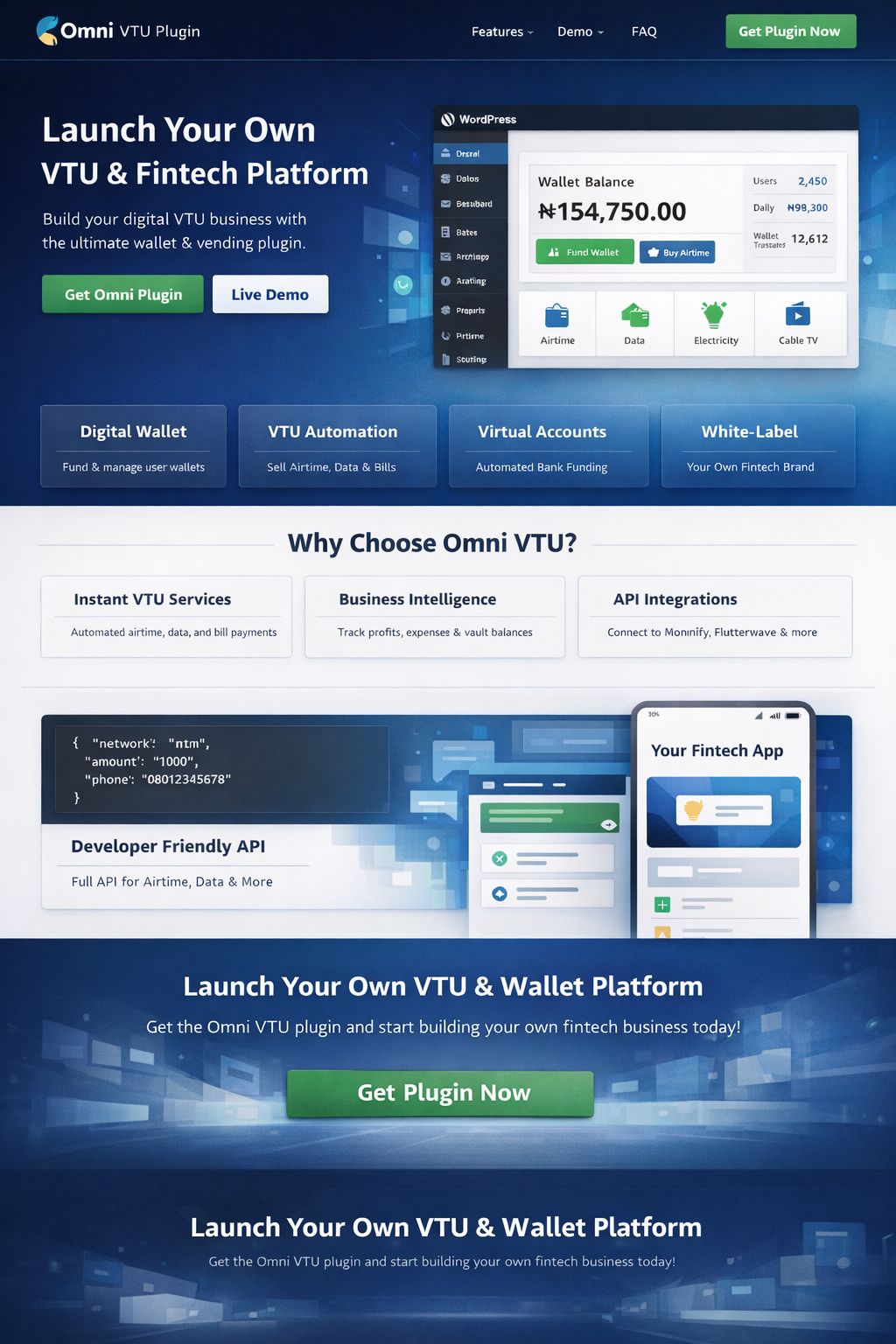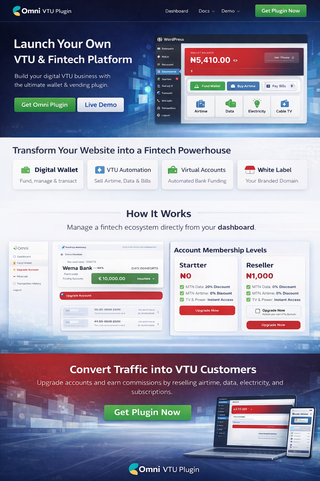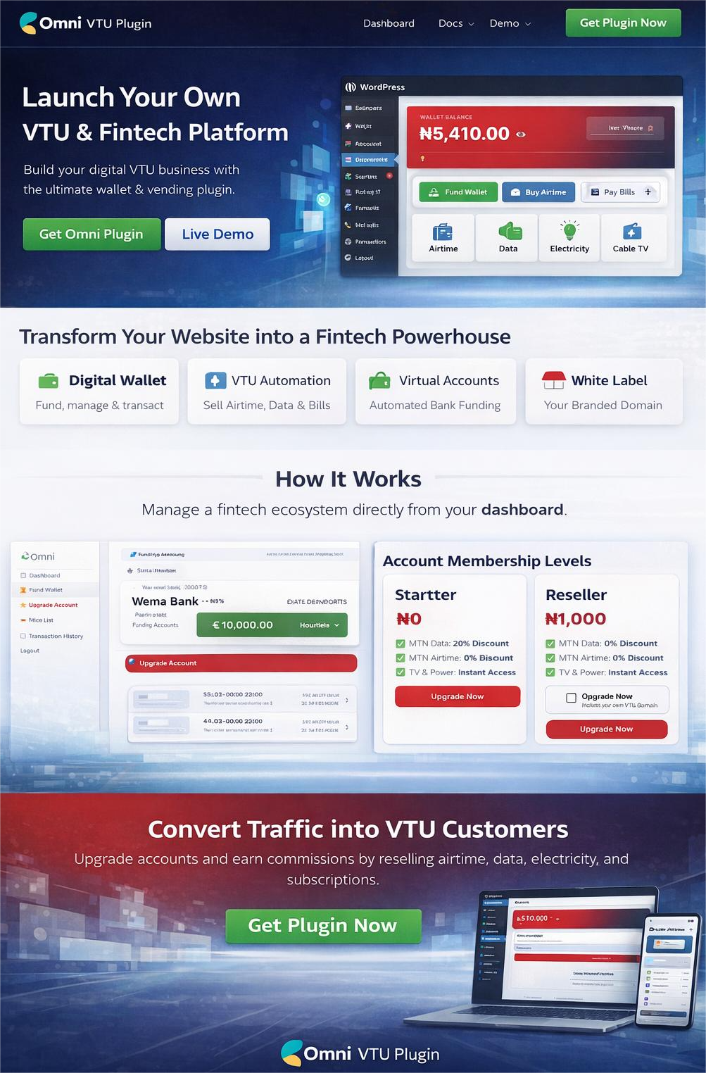 OmniWallet Fintech is a powerful WordPress fintech plugin designed to launch your own VTU, wallet, and digital services platform.