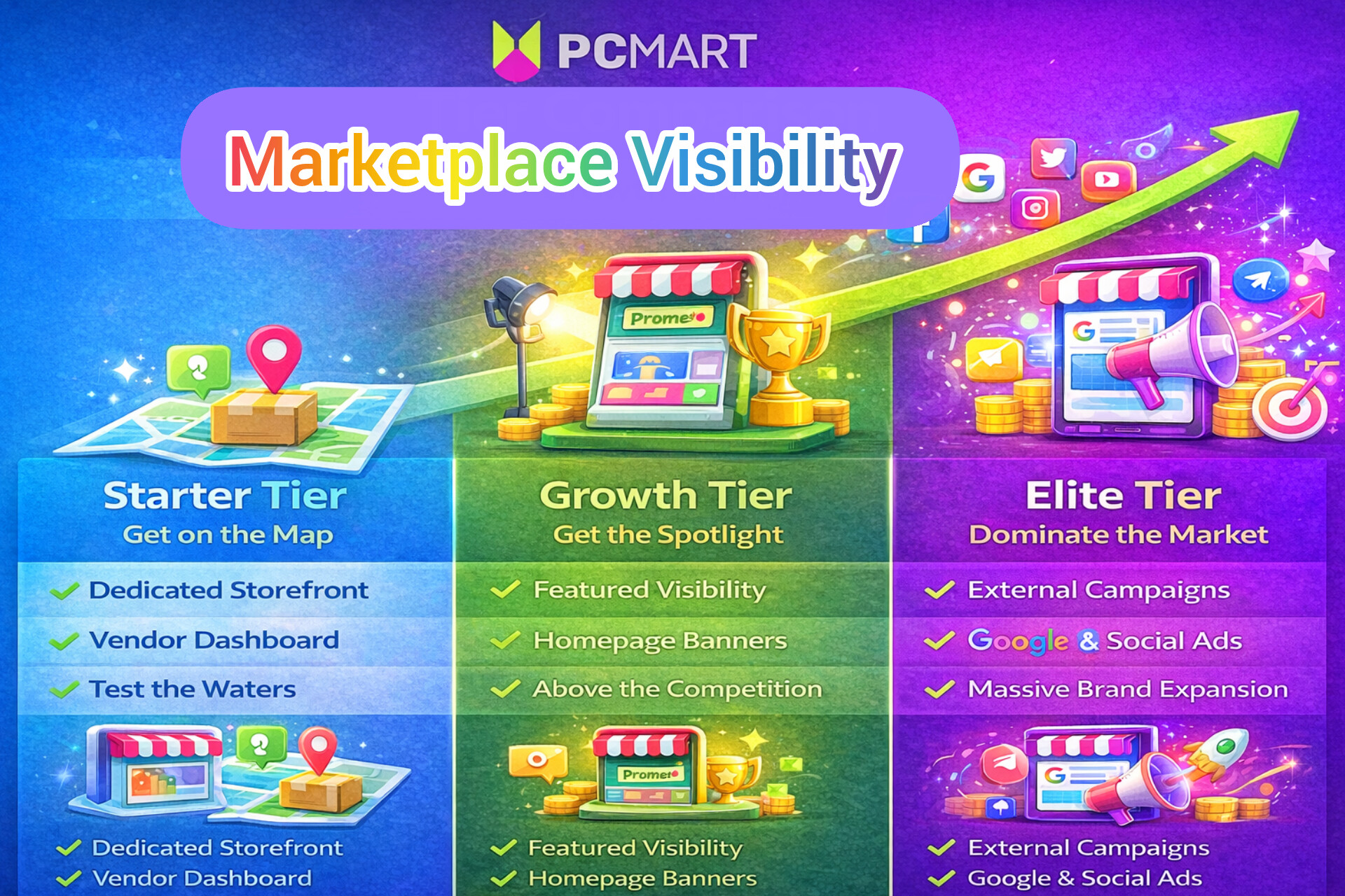 • The Power: We leverage the PC Mart marketing engine to put your products on Google Search Ads and Social Media. Your brand travels everywhere your customers go.