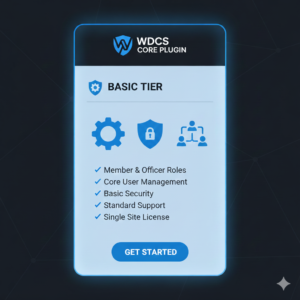 | Security & Access | Standard PIN authentication framework ready (requires WDCS Security Addon), Basic User Blocking. | + Advanced Dashboard Routing (Officer dashboard separate from Member dashboard), Enhanced Admin Access Security. | + REST API Endpoints for Mobile App (Essential for external app build), Mobile Invite Framework. |